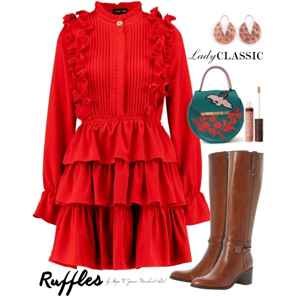 - Canonical Look: Reimagined archival style board, Lady Classic: Fall Ruffles in Red, a contemporary high-fashion take on a vintage style silhouette with boldness & elegance