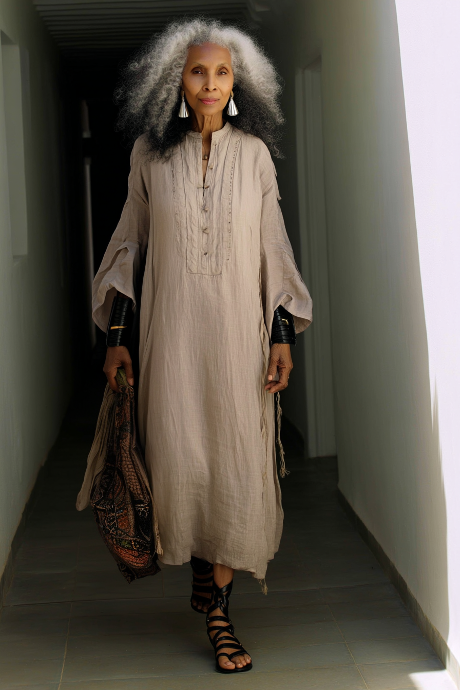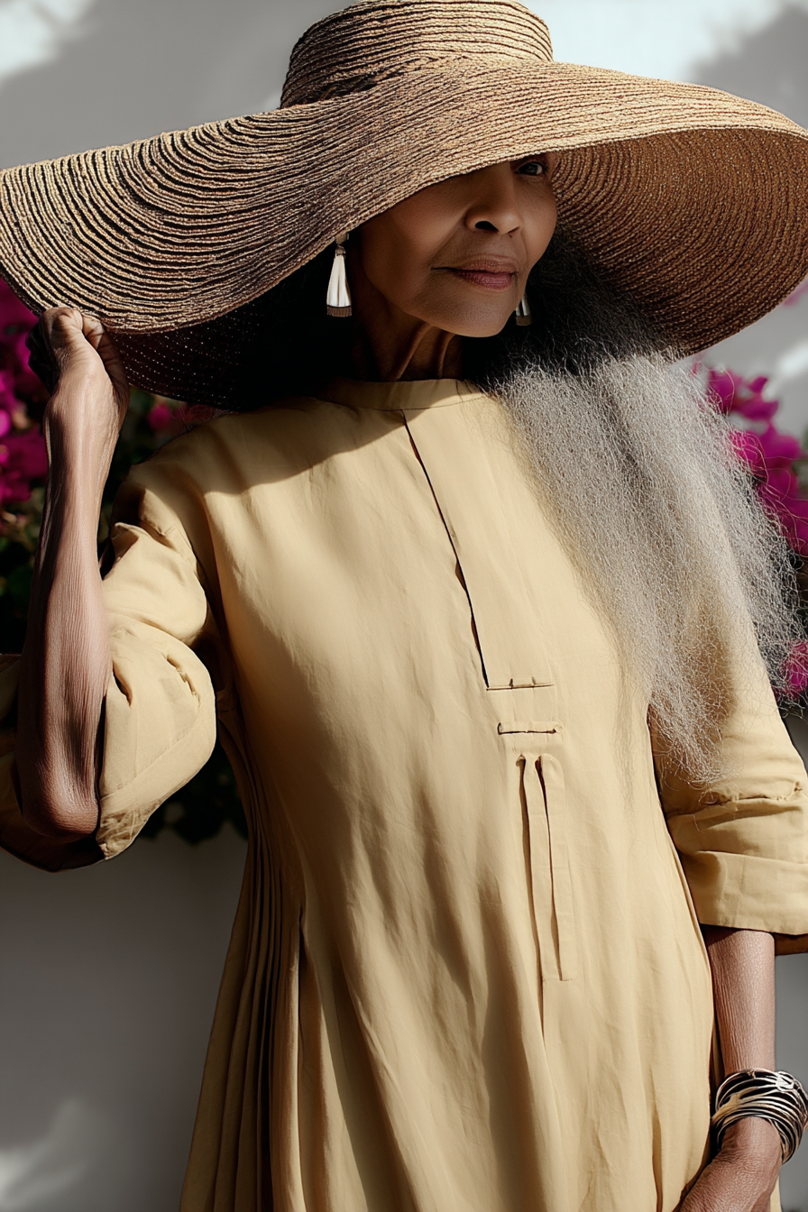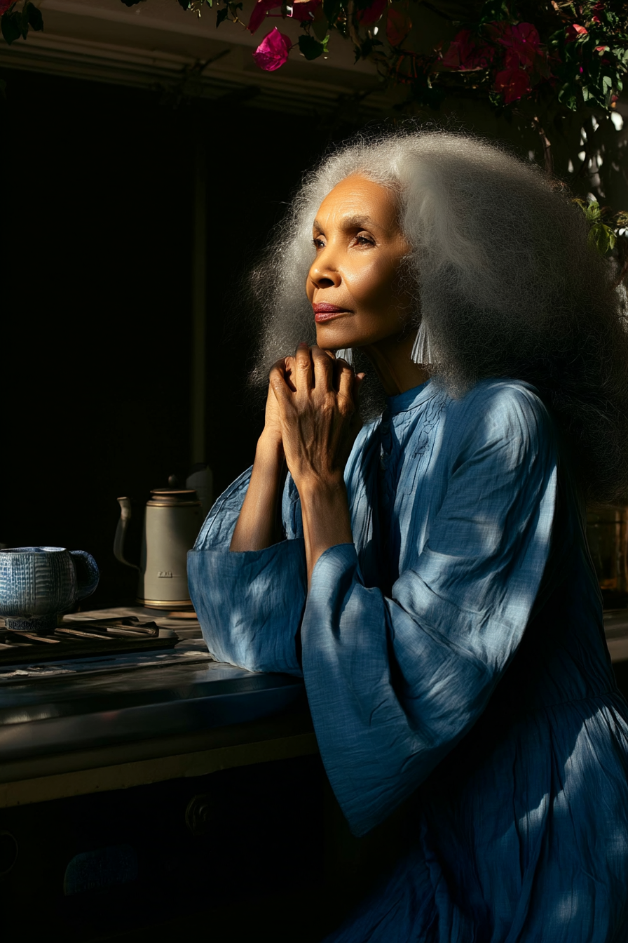 A woman of ninety years and beyond, she embodies hope not as anticipation, but as endurance — the kind carried quietly through hands, kitchens, gardens, and generations. Of Greek descent with Mediterranean and Ethiopian lineage, her history is not announced but absorbed, woven into the warmth of her olive skin, the fullness of her silver curls, and the way she inhabits light and space without urgency.