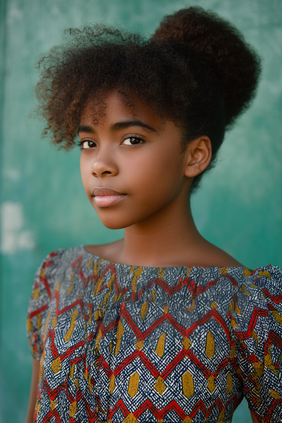 - Hair: Shoulder-length mixed-texture afro with soft bangs (canonical)