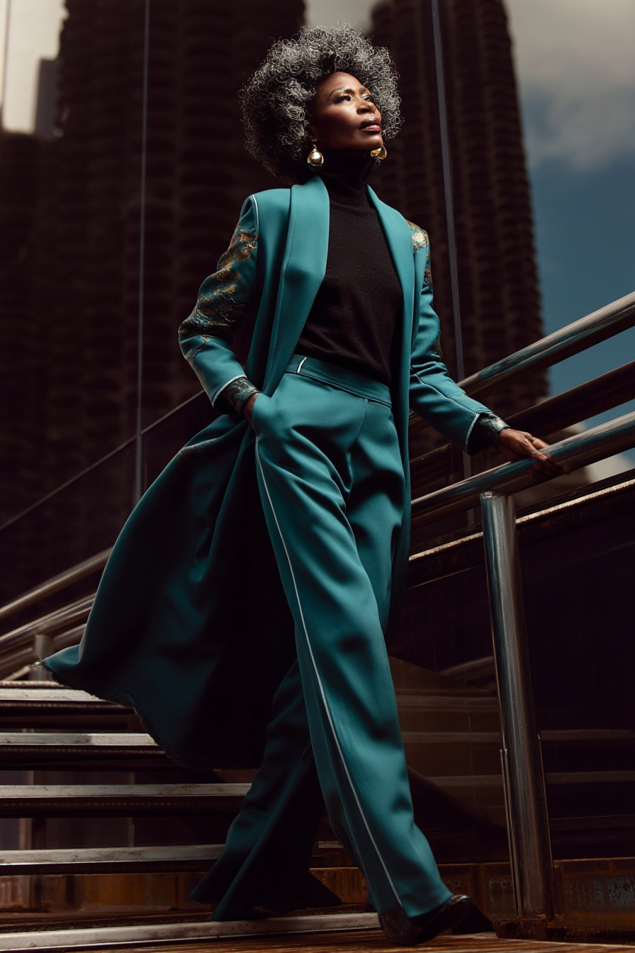 • Styling Notes: Structured silhouettes, minimal ornament, functional authority