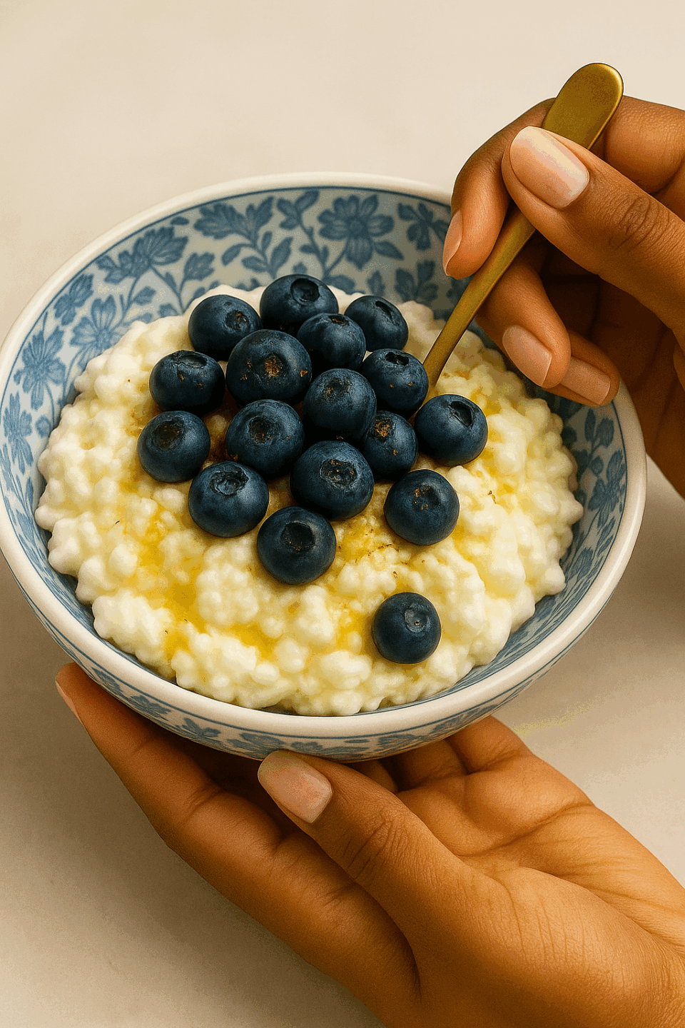 Spoon cottage cheese into a small bowl. Top with blueberries, agave, and ginger. Savor!